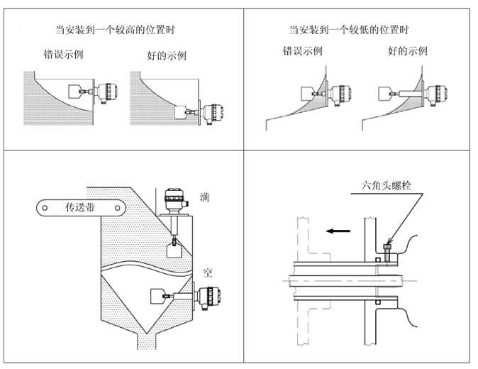 如果將阻旋式料位開(kāi)關(guān)安裝在喂料口的正下方時(shí),在粉末顆?;蛘呤橇隙穬?nèi)形成的“橋‘’崩塌的影響下,會(huì)損壞料位開(kāi)關(guān),這時(shí)應(yīng)當(dāng)更換安裝位置,或者為產(chǎn)品提供一個(gè)防護(hù)板。