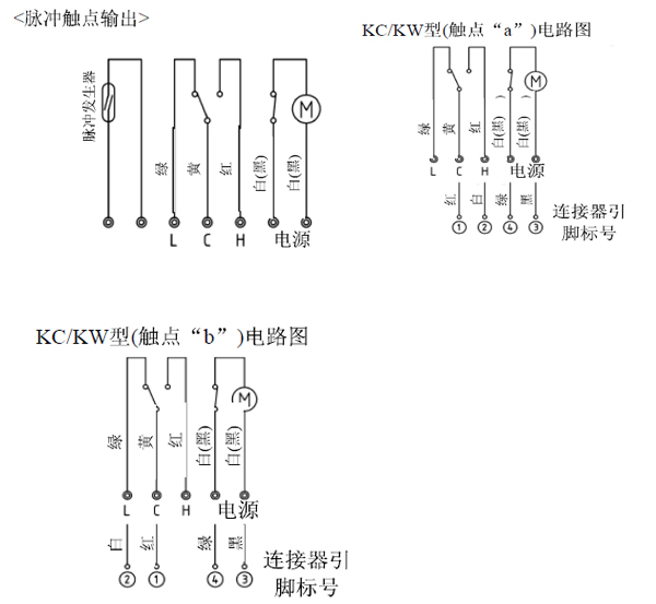 PRL-100系列阻旋式料位開關指示燈/脈沖觸點信號電路的接線方法如下:
